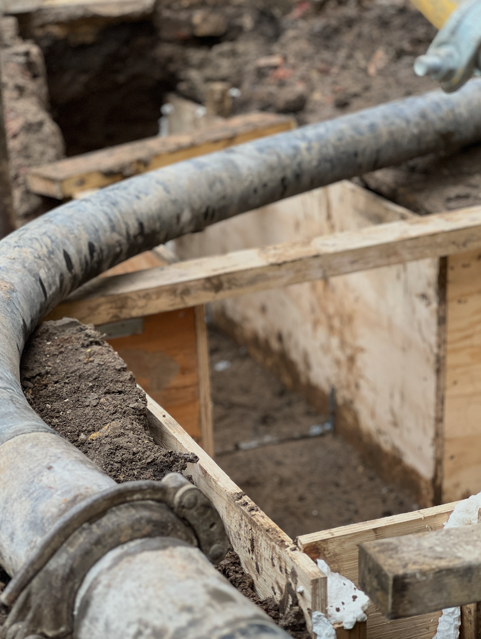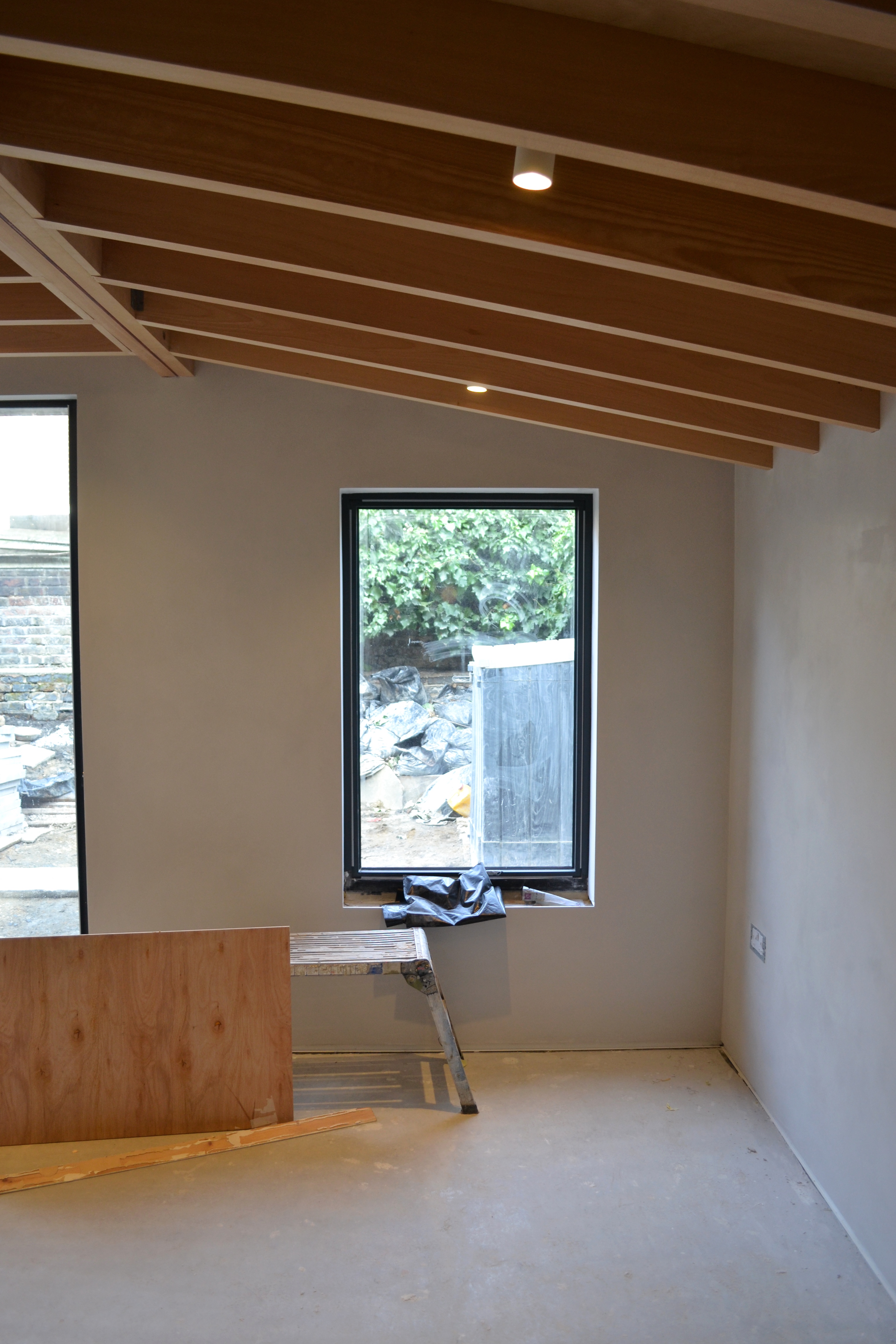 A key challenge emerged early on: once the groundworks were complete, the available height to the underside of the existing floor joists was limited to just 2.4m, with no scope to alter the structural datum. Working closely with the architect Robin Morgan, we developed a pitched extension form that maximised internal headroom while carefully coordinating floor build-ups with the upstairs window sill heights. Wet underfloor heating was installed throughout to maintain clean ceiling lines and a calm spatial quality.